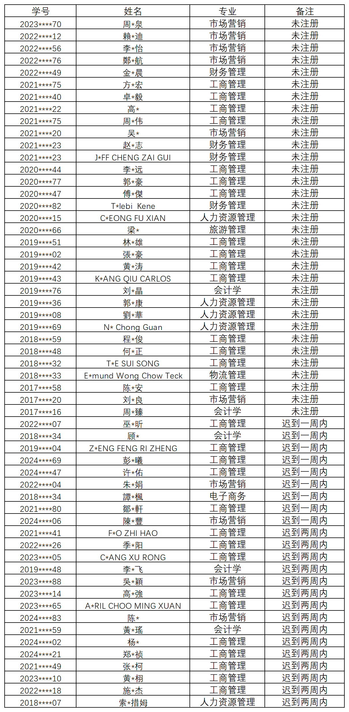 根据中华人民共和国教育部《普通高等学校学生管理规定》第十二条、第三十条、《暨南大学本科学生学分制学籍管理规定》第四条、第四十四条以及《管理学院本科学生注册管理办法(2024年修订)》的规定,周*泉等58名学生2026年春季(2026年3月8日至3月20日)未按规定办理请假手续,违反注册规定。