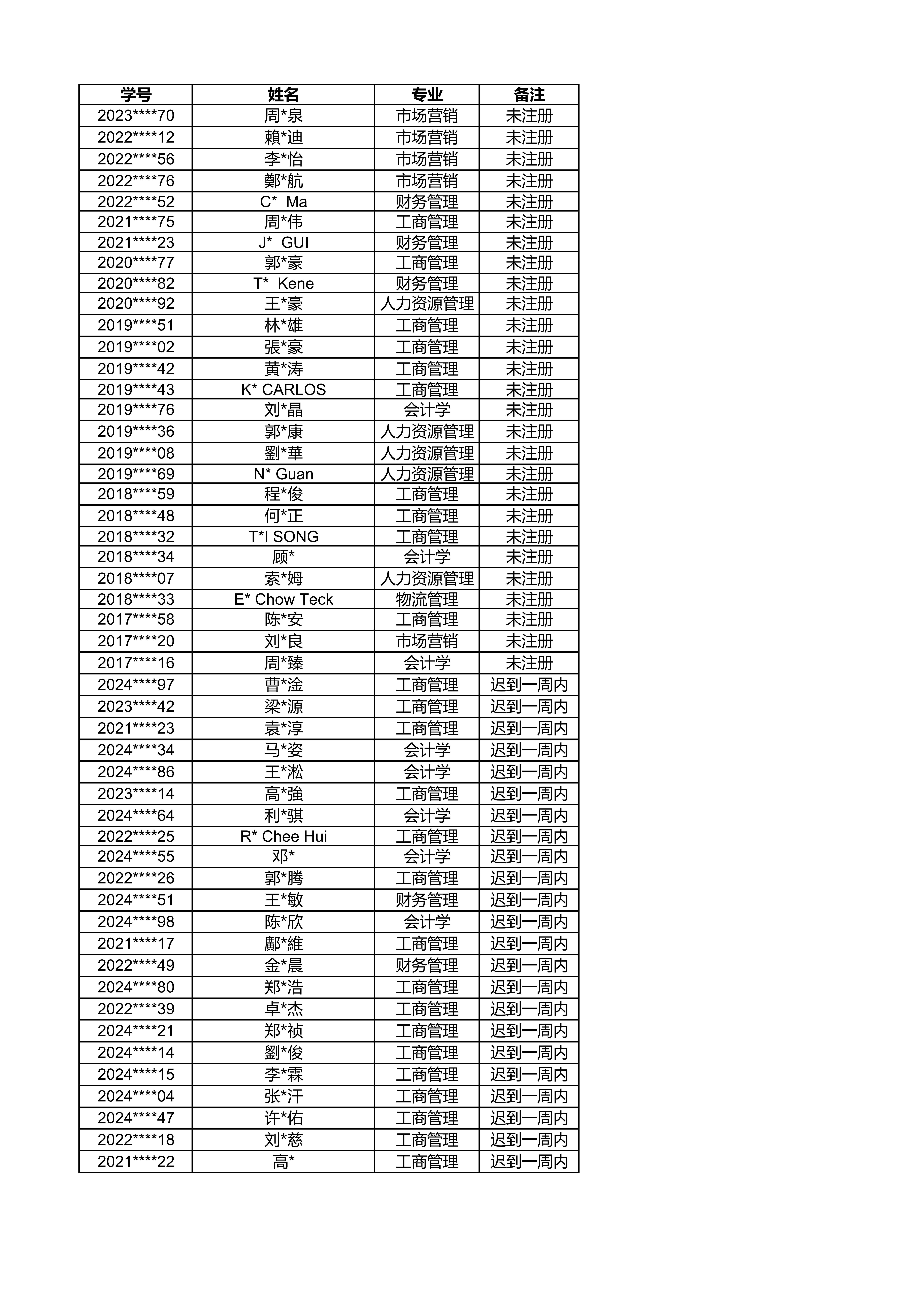 2025-10-09根据中华人民共和国教育部《普通高等学校学生管理规定》第十二条、第三十条、《暨南大学本科学生学分制学籍管理规定》第四条、第四十四条以及《管理学院本科学生注册管理办法(2024年修订)》的规定,周*泉等50名学生2025年秋季(2025年9月15日至9月26日)未按规定办理请假手续,违反注册规定。现对其违规情况进行公示,公示时间为7天(自10月9日至10月16日止),若对上述情况有异议,请书面或来电反映,受理单位:管理学院本科教育管理办公室。地址:番禺校区知识产权楼903。电话:85227102。电子邮箱ojwxx@jnu.edu.cn。请提出意见的同志署真实姓名及单位,以便核实情况。特此公示!管理学院2025年10月9日